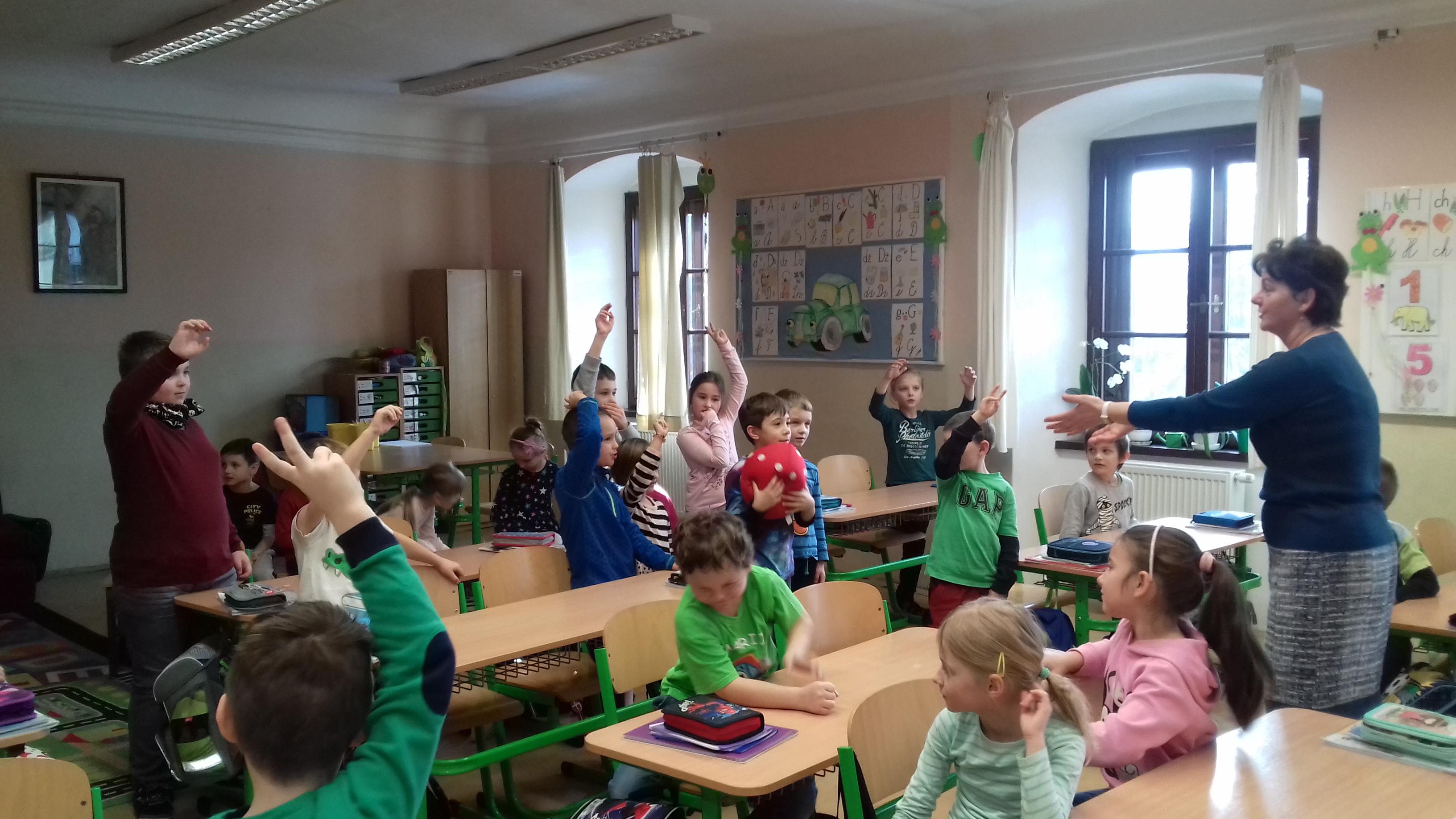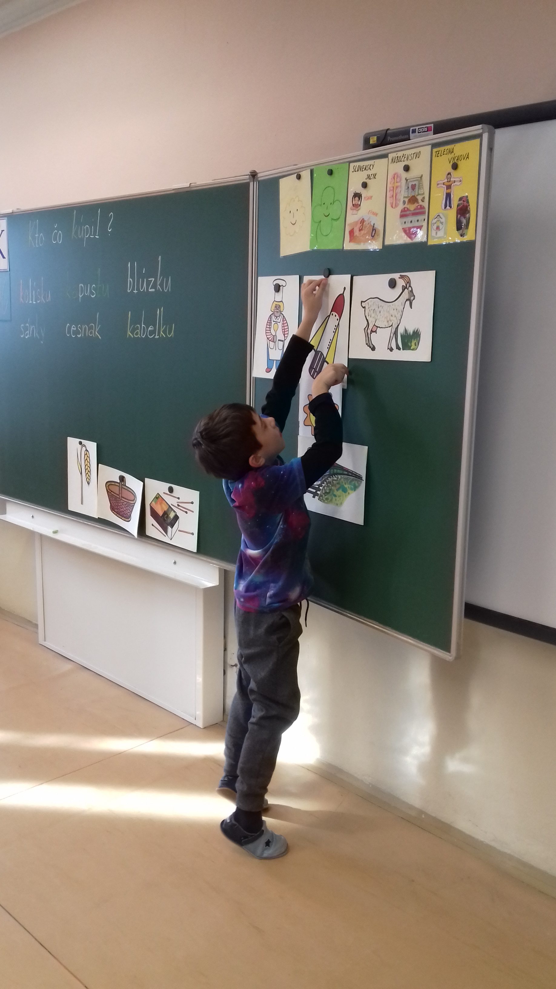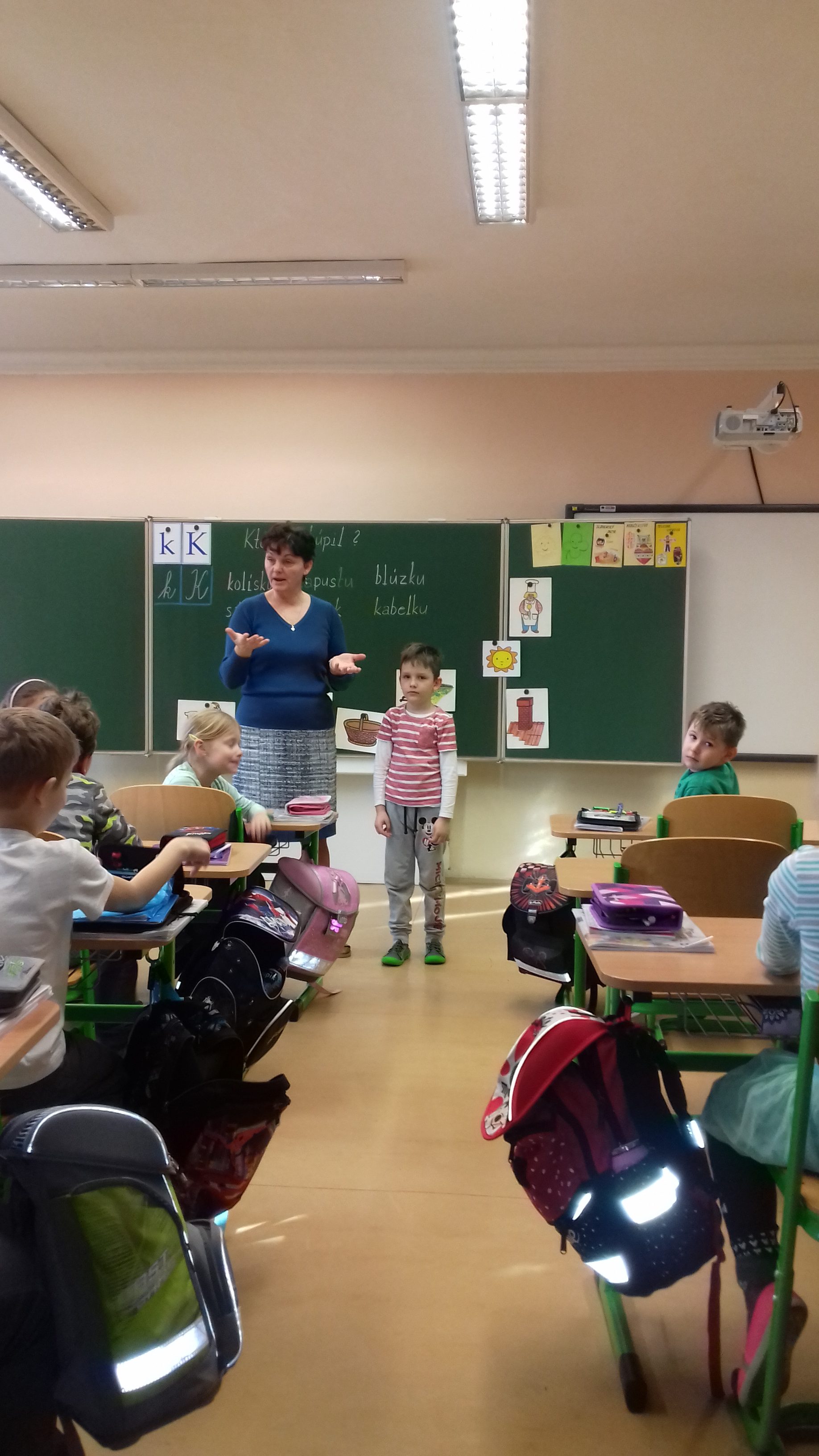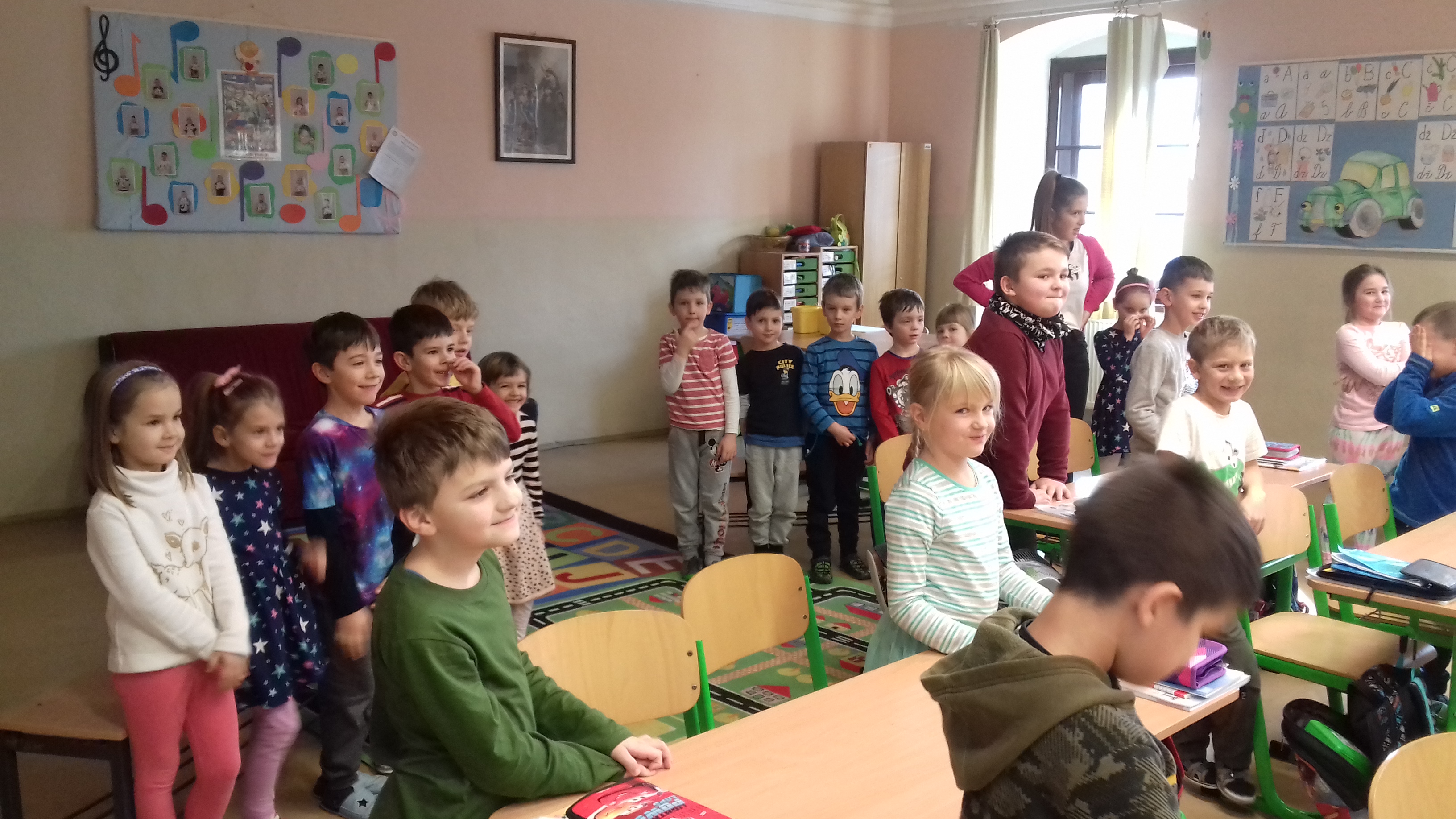Predškoláci u prvákov Naši predškoláci navštívili prvákov na hodine slovenčiny. S radosťou sa zapojili do priebehu hodiny a išlo im to perfektne