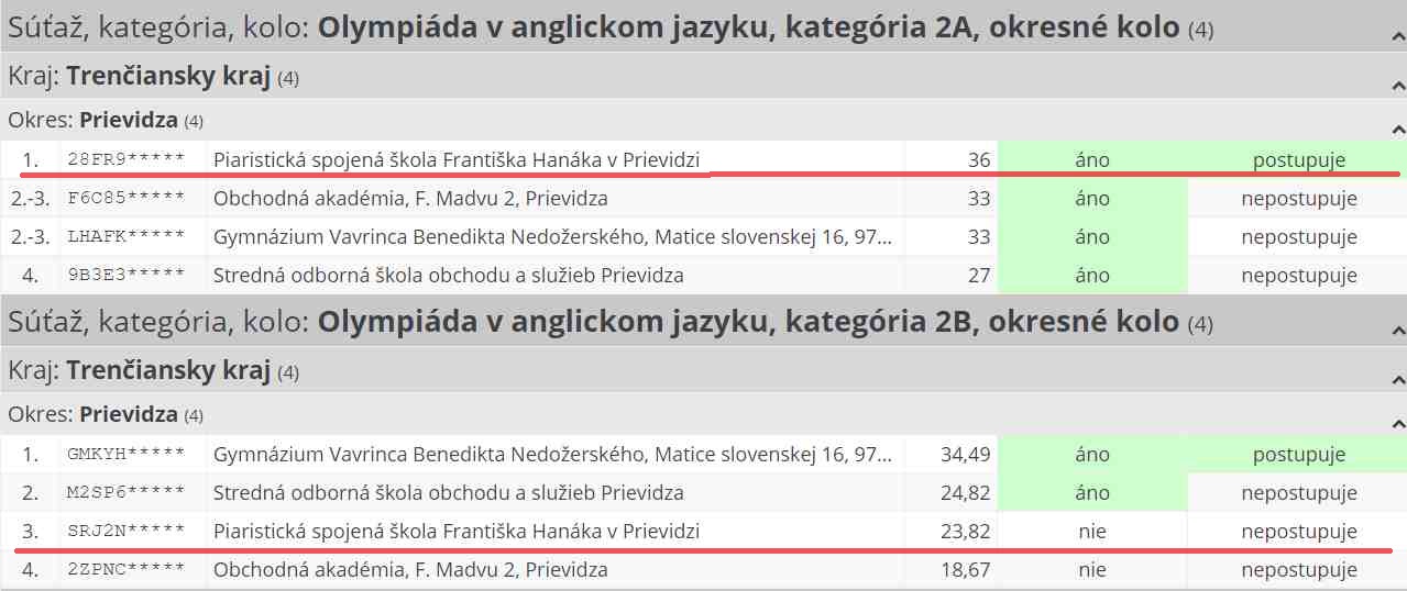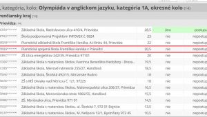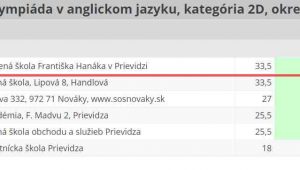 Dňa 13. januára sa konalo v online prostredí EduPage okresné kolo anglickej olympiády. Za našu školu súťažili Bruno Blair Buček (6.A, kat. 1A), Dávid Kollár (sekunda, kat. 1A), Natália Korineková (tercia, kat. 1B), Nikoletta L. Šnircová (sexta, kat. 2A), Veronika Gašparovičová (oktáva, 2B) a Adam Puna (4F, kat. 2D).